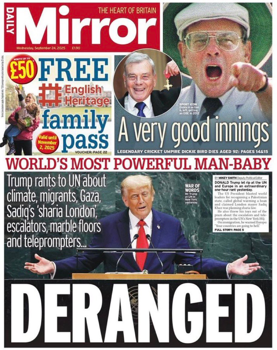 The Daily Mirror reported on the president’s lie-filled speech to the United Nations on Tuesday via the one-word, withering headline “DERANGED.”