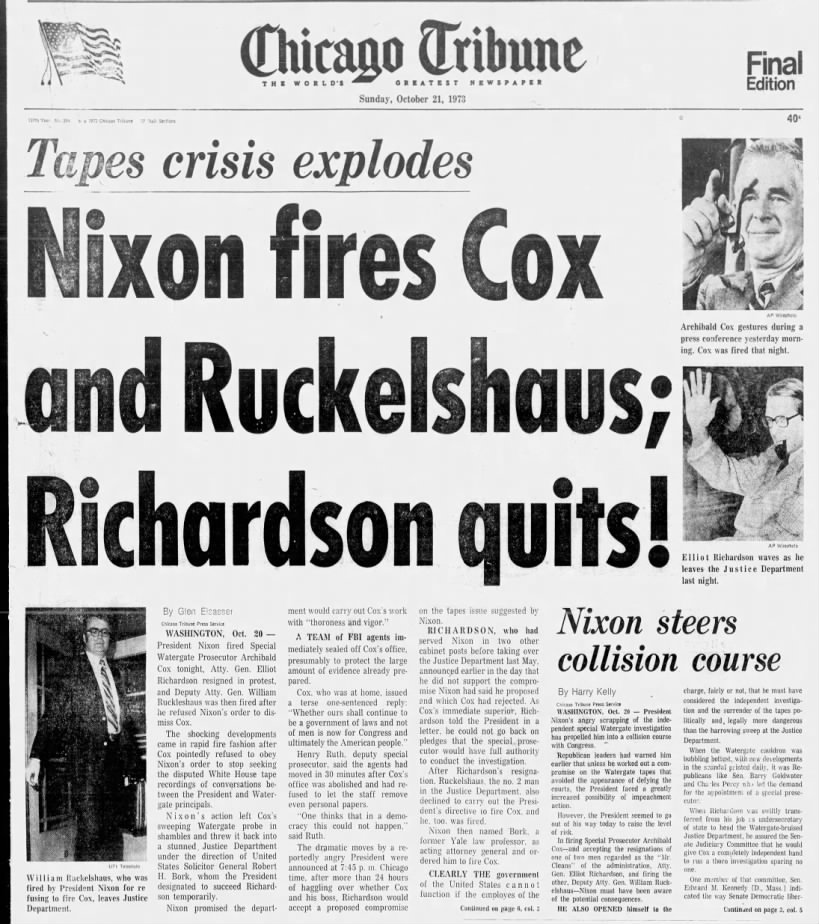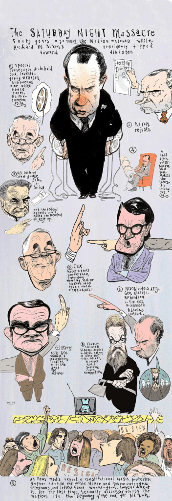 What is happening now, one could call this the “Holy Week Massacre,” in remembrance of Nixon’s “Saturday Night Massacre.” According to Sky History and Wikipedia, “The ‘Saturday Night Massacre’ occurred on October 20, 1973, during the Watergate scandal when President Richard Nixon fired special prosecutor Archibald Cox after Attorney General Elliot Richardson and Deputy Attorney General William Ruckelshaus resigned rather than comply. This event marked a turning point in the Watergate scandal, leading to widespread public outrage and the eventual impeachment proceedings against Nixon.